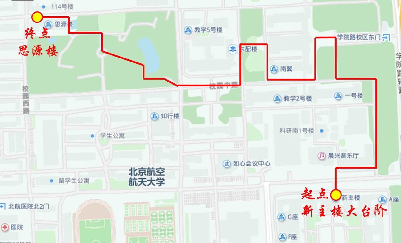 參加活動的教職工集體從新主樓大臺階出發(fā),途經晨興音樂廳,經東南門附近小門進入教學區(qū),沿教學區(qū)東側小路經東門校訓石大步走至教學區(qū)主樓東門,經主樓南側小路繞行至主M樓西門,穿過小花園、途徑圖書館走出教學區(qū),由綠園東南側小門進入綠園,途徑荷花池南側經靜園小橋、湖邊晨練小廣場、綠園中心大松樹、綠園西北側晨練小廣場等標志性場景,由綠園西北小門走出綠園,最終大步走至終點思源樓,全程約1.5千米。