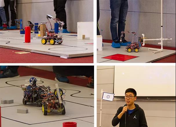 本屆“啟先杯”加入的兩組對(duì)決競(jìng)爭(zhēng)元素使得比賽更具看點(diǎn)。比賽由“八進(jìn)四”、“半決賽”、“季軍爭(zhēng)奪賽”以及“冠軍爭(zhēng)奪賽”賽制產(chǎn)生排名順序,每輪比賽包含“到達(dá)基地”、“建立基地”與“升起旗幟”三個(gè)環(huán)節(jié)。晉級(jí)決賽的8支隊(duì)伍作品各具特色,比賽操作控制技巧各有特點(diǎn),其中部分隊(duì)伍采用PID閉環(huán)自動(dòng)控制技術(shù)實(shí)現(xiàn)小車(chē)的控制功能,比賽過(guò)程中“建立基地”設(shè)置的“凸”形模塊和“球”型模塊的爭(zhēng)奪成為各組對(duì)決的焦點(diǎn),激烈的競(jìng)爭(zhēng)使得賽場(chǎng)上的小車(chē)們使出渾身解數(shù),有的隊(duì)伍將模塊藏在了車(chē)身以下,有的隊(duì)伍將模塊藏在了機(jī)械臂與車(chē)身之間,靈巧的結(jié)構(gòu)設(shè)計(jì)與精妙的控制算法成為制勝的關(guān)鍵。比賽最終由機(jī)械學(xué)院夢(mèng)拓李強(qiáng)帶領(lǐng)的士嘉書(shū)院2017級(jí)新生組建的“翱翔者隊(duì)”獲冠,隊(duì)長(zhǎng)閆琦同學(xué)分享了團(tuán)隊(duì)建設(shè)、克服困難、成員共同學(xué)習(xí)與進(jìn)步的經(jīng)歷。