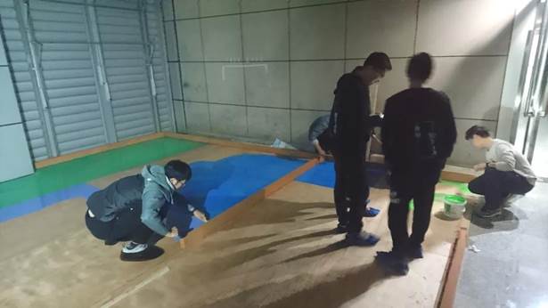 當搭建場地的材料到貨后,隊員們立刻投入到場地的搭建中。無論是鋪木板,打釘槍,還是刷油漆,這些都難不倒機器人隊的小伙子們。