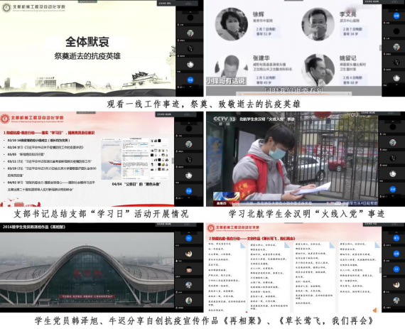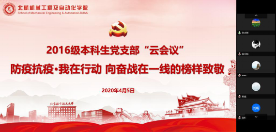 4月5日晚,機械工程及自動化學(xué)院2016級本科生黨支部圍繞“防疫抗疫·我在行動——向奮戰(zhàn)在一線的榜樣致敬”主題開展支部云視頻會議。