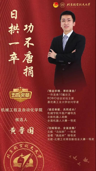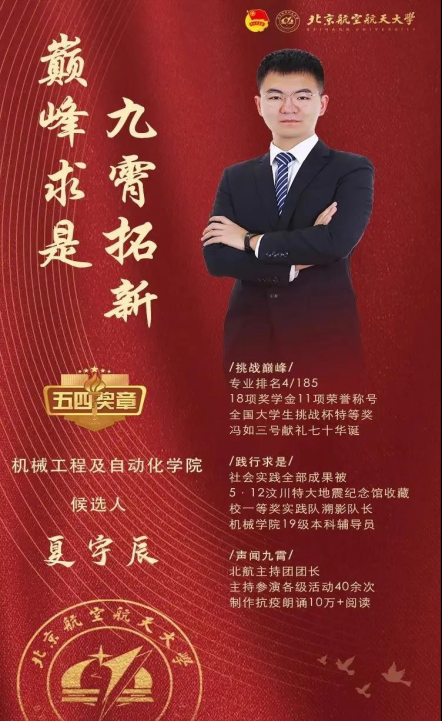 2020年12月23日,機械工程及自動化學院2017級本科生夏宇辰、2016級黃晉國分獲本科生組、研究生組北京航空航天大學第十六屆“五四獎?wù)隆睒s譽,機械學院“五四獎?wù)隆毕搏@雙獎?wù)隆?/span>
