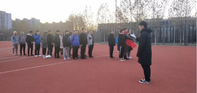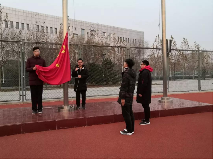 凜冽寒風(fēng),微微晨曦,6點50分,180711和180721兩個團支部按時在操場邊上集結(jié)完畢。7點,兩個小班的4名同學(xué)組成國旗護衛(wèi)小隊,在雄壯的國歌中將國旗緩緩升上。再怕冷的同學(xué)這時也把手從袋子里伸出,肅立高唱國歌,目光凝視著國旗緩緩上移,移到那片明亮而清澈的天空。