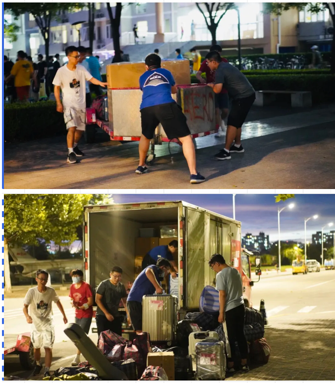 9月1日晚,1807大班組織幾十名男生志愿者幫助女生將已經(jīng)收拾好的行李從三公寓轉(zhuǎn)移裝車。