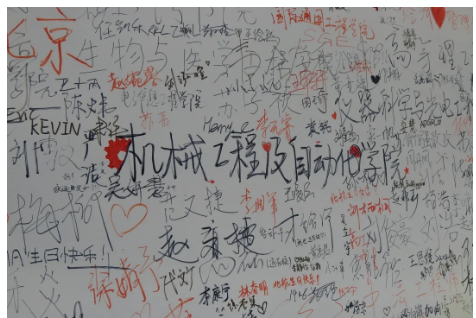 校慶祝福體驗(yàn)區(qū)由歷史長(zhǎng)廊和校慶背景墻兩部分組成。歷史長(zhǎng)廊以時(shí)間為軸,以北航大事記照片組成展板;校慶背景墻可供校友簽名、合影留念。