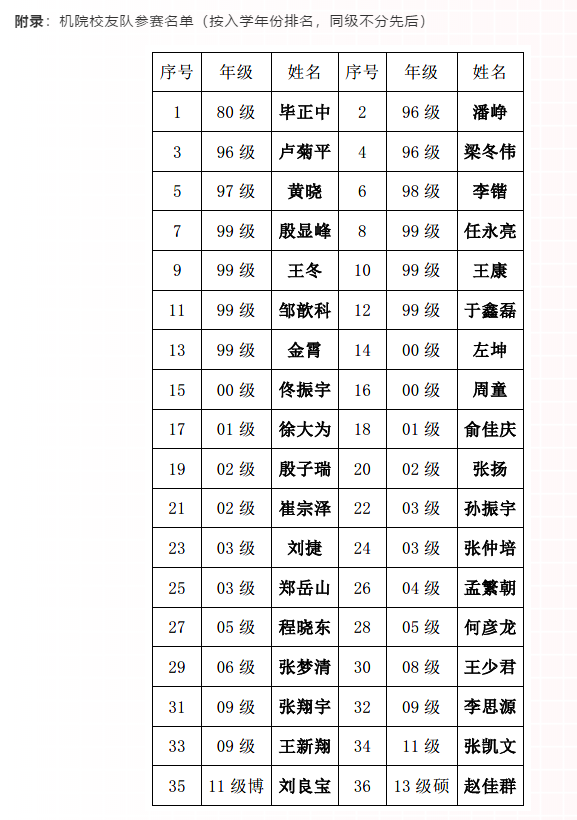 北航機(jī)械學(xué)院98年建院之時(shí),合并了當(dāng)年的7系和老10系,將北航校友足球最強(qiáng)勢(shì)的兩支球隊(duì)收入囊中,而99級(jí)本科生殷顯峰作為新7系的首任隊(duì)長(zhǎng),更是以身作則,團(tuán)結(jié)整合兩支強(qiáng)大的力量,以極強(qiáng)的責(zé)任感和擔(dān)當(dāng),對(duì)機(jī)械學(xué)院的熱愛(ài),一直活躍在機(jī)院校友足球圈。本屆比賽機(jī)院校友隊(duì)更是囊括了上至80級(jí),下至14級(jí)橫跨34年的諸多校友,他們?cè)谫悎?chǎng)上秉承著北航多年來(lái)傳承下的公平、友愛(ài)和拼搏的精神競(jìng)技,在賽場(chǎng)下利用校友足球賽的平臺(tái)以球會(huì)友,發(fā)揚(yáng)北航人幫北航人,機(jī)械人幫機(jī)械人的精神,帶動(dòng)了年輕一代甚至在校生的成長(zhǎng)與發(fā)展。