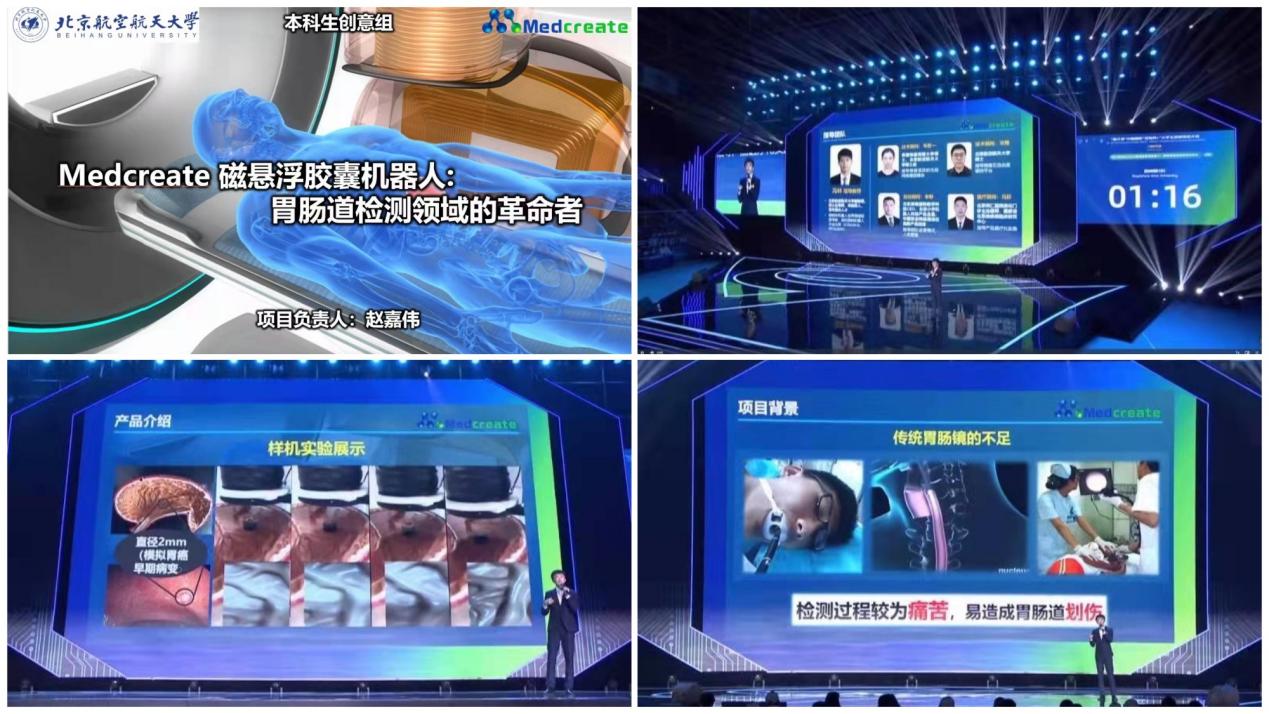 10月12日至15日,由教育部等12個(gè)中央部委單位和江西省人民政府共同主辦,南昌大學(xué)、南昌市人民政府承辦的第七屆中國(guó)國(guó)際“互聯(lián)網(wǎng)+”大學(xué)生創(chuàng)新創(chuàng)業(yè)大賽總決賽在南昌大學(xué)舉行,我院選送的“Medcreate磁懸浮膠囊機(jī)器人:胃腸道檢測(cè)領(lǐng)域的革命者”(指導(dǎo)教師:馮林副教授,主要完成人:2018級(jí)機(jī)械學(xué)院本科生王新陽(yáng)、趙嘉偉等)在入圍總決賽的1085個(gè)項(xiàng)目中脫穎而出,獲得高教主賽道金獎(jiǎng),并以小組第一的成績(jī)?nèi)雵究粕惖廊龔?qiáng)賽,獲得全國(guó)第五的好成績(jī)。繼2020年12月獲得全國(guó)挑戰(zhàn)杯創(chuàng)業(yè)大賽金獎(jiǎng)、2021年7月北航機(jī)器人隊(duì)獲得全國(guó)機(jī)器人大賽季軍之后,學(xué)院學(xué)子再獲全國(guó)獎(jiǎng)殊榮。