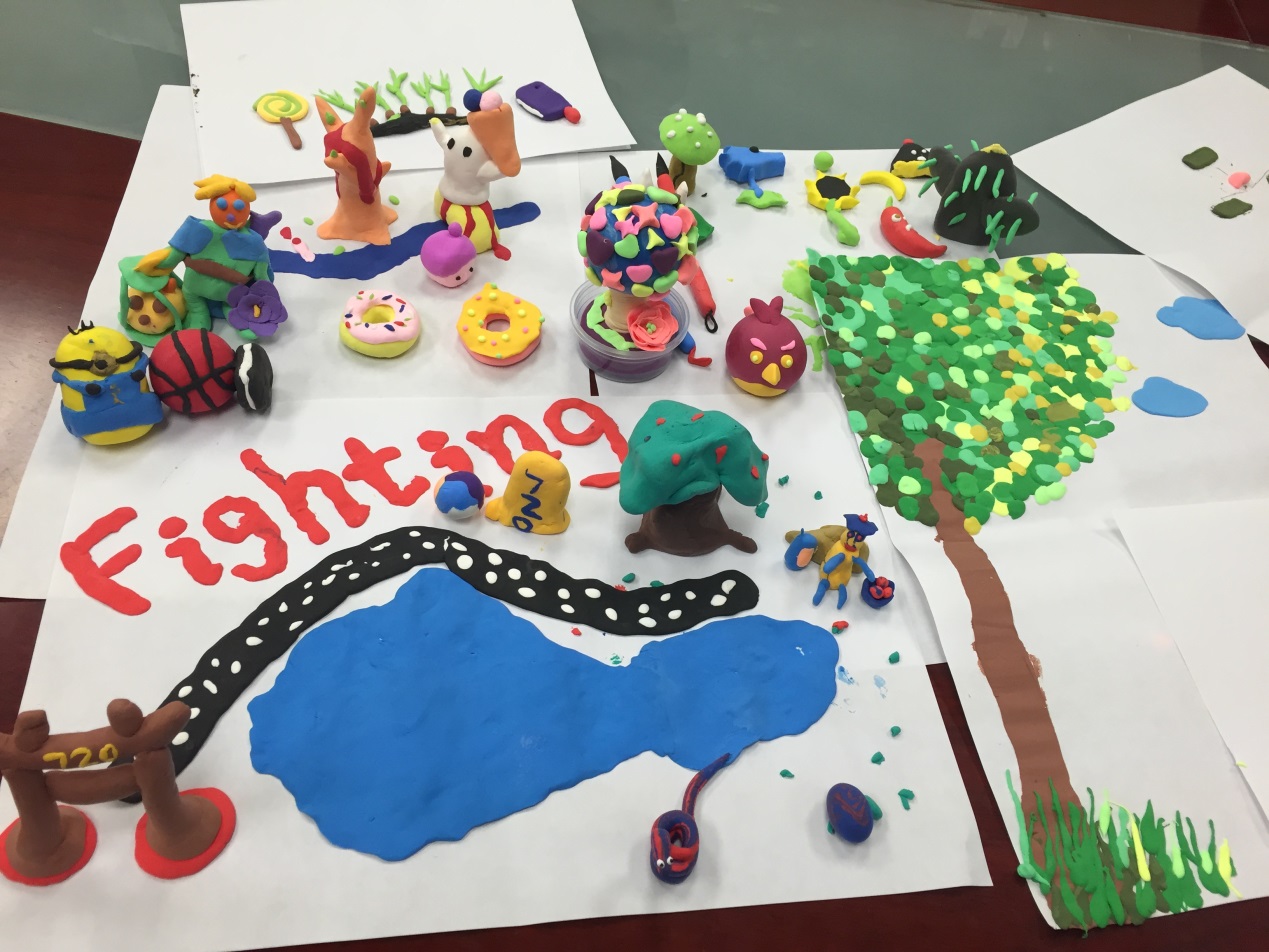 活動接近尾聲,但是每個(gè)作品和成員的發(fā)言仍歷歷在目。例如:以許少鵬同志為代表的隊(duì)伍用粘土繪制了一幅完美的自然景觀圖,圖中有紅色的大寫英文單詞“Fighting”,象征著我們720-2黨支部積極樂觀的精神,圖中有茂密的大樹、扁長的石子路、蔚藍(lán)的湖泊,靈動的小蛇,辛勞的農(nóng)夫,還有標(biāo)著“720”的大門,象征著黨支部的大門永遠(yuǎn)向大家敞開,所有的這些都構(gòu)成了一幅美麗的、完整的畫面,象征著720是一個(gè)溫馨、團(tuán)結(jié)、樂觀、向上的大家庭。以郭鴻杰同志為代表的隊(duì)伍用黃色、翠綠色、深綠色的粘土拼湊出了茂密的參天大樹,星星點(diǎn)點(diǎn)的葉子象征著支部成員,在平日里各自忙碌的大家為了同一個(gè)目標(biāo),或者在同一個(gè)大家庭中凝聚在一起,共同組成了無所畏懼的大數(shù),美麗的構(gòu)圖將這樣的含義完美的展現(xiàn)。以韓寧同志為代表的隊(duì)伍用藍(lán)色的圓球代表健康、無污染的地球母親,用各色各樣的愛心、星星點(diǎn)綴在球上,然后在底座上鋪滿綠色象征草地,再在草地上點(diǎn)綴一直美麗的玫瑰花,最后完成了一顆立體的形似大樹的作品,它的創(chuàng)作靈感來源于保護(hù)地球、保護(hù)自然資源、保護(hù)花草樹木的環(huán)保意識,號召大家熱愛環(huán)境,懷抱自然。