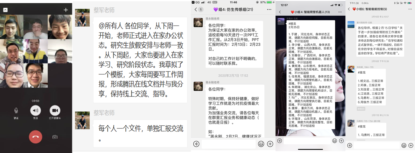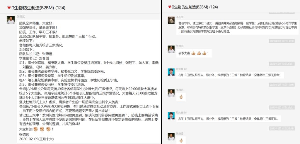 按照黨支部統(tǒng)一部署要求,團(tuán)隊(duì)開展了每日?qǐng)?bào)平安、報(bào)業(yè)務(wù)、報(bào)思想的“三報(bào)”行動(dòng),并制定了詳細(xì)的執(zhí)行方案,精準(zhǔn)掌握?qǐng)F(tuán)隊(duì)師生知疫情、防疫情、科研、思想等情況。團(tuán)隊(duì)分為6個(gè)小組,小組每天接龍上報(bào)三報(bào)情況,小組組長(zhǎng)負(fù)責(zé)統(tǒng)計(jì),每天22點(diǎn)前耿大喜老師統(tǒng)計(jì)小組長(zhǎng)匯報(bào)的組內(nèi)情況,并將團(tuán)隊(duì)三報(bào)異常情況公布到團(tuán)隊(duì)師生大群內(nèi)。