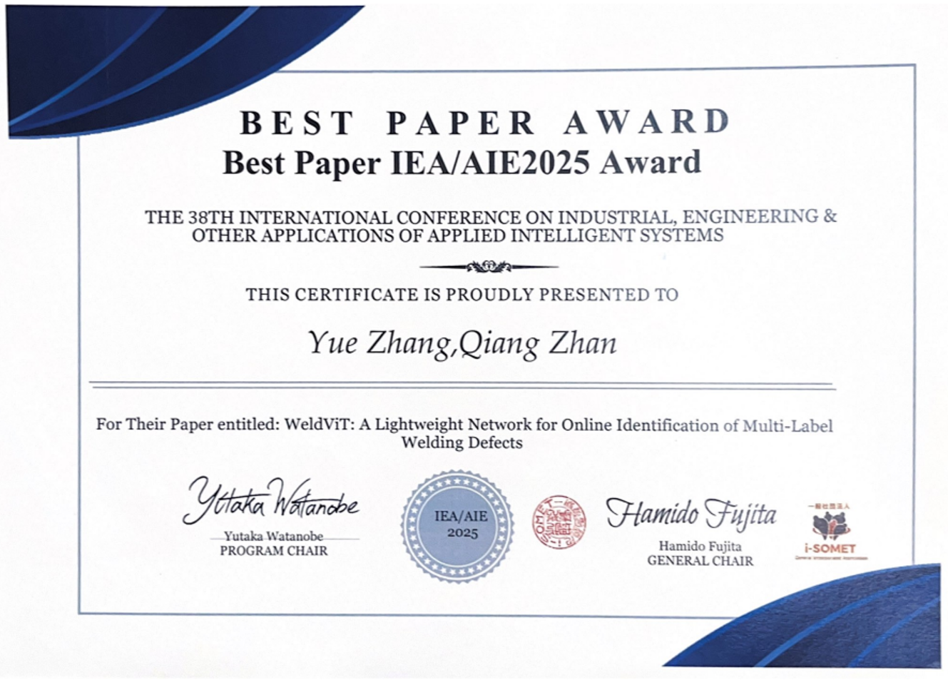 近日,我院機(jī)器人研究所戰(zhàn)強(qiáng)教授團(tuán)隊(duì),在第38屆International Conference on Industrial, Engineering & other Applications of Applied Intelligent Systems(IEA/AIE?2025,日本)上發(fā)表的論文“WeldViT: A Lightweight Network for Online Identification of Multi-Label Welding Defects”,榮獲大會(huì)“最佳論文獎(jiǎng)(Best Paper Award)”。該會(huì)議是工業(yè)智能應(yīng)用領(lǐng)域著名的國際會(huì)議。博士生張悅為論文第一作者,戰(zhàn)強(qiáng)教授為論文唯一通訊作者,北京航空航天大學(xué)為唯一完成單位。