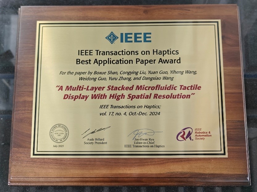 機(jī)械學(xué)院王黨校教授團(tuán)隊(duì)獲IEEE Transactions on Haptics最佳應(yīng)用論文獎(jiǎng)