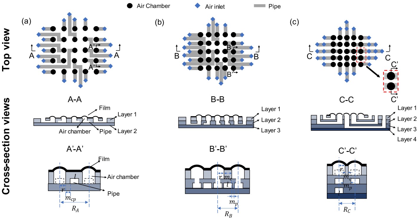 針對(duì)以上挑戰(zhàn),王黨校教授團(tuán)隊(duì)結(jié)合3D微流體結(jié)構(gòu)設(shè)計(jì)和先進(jìn)多層軟光刻工藝,創(chuàng)新性地提出了一種基于三維倒金字塔流體網(wǎng)絡(luò)的高分辨率觸覺顯示器。不同于傳統(tǒng)的單層流體布線策略,該策略按照“由內(nèi)向外、自下而上”的原則排布流體通道,即將陣列外圍單元的氣路層疊于內(nèi)部單元之上,從而在有限垂直空間中實(shí)現(xiàn)了無(wú)干擾的氣路布局。這一策略有效提升了氣動(dòng)執(zhí)行單元的集成密度,同時(shí)保持了每個(gè)執(zhí)行器的獨(dú)立可控性,為構(gòu)建高分辨率的觸覺紋理顯示系統(tǒng)提供了關(guān)鍵技術(shù)支撐。進(jìn)一步,研究團(tuán)隊(duì)結(jié)合該立體微流體布線策略,開發(fā)出一款空間分辨率達(dá)1.25?mm、可匹配指尖感知閾限的柔性微流體觸覺顯示器。該裝置采用多層軟光刻工藝制備,通過多層堆疊實(shí)現(xiàn)了高密度微流體驅(qū)動(dòng)單元的柔性集成,兼具高分辨率、柔性與高擴(kuò)展性等優(yōu)勢(shì),顯著提升了觸覺紋理的顯示精度與場(chǎng)景適應(yīng)性。