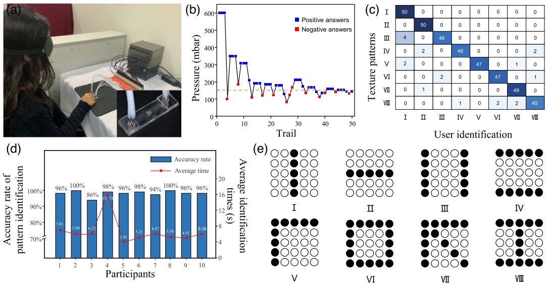 研究團(tuán)隊(duì)在不同輸入壓力條件下對(duì)微流體觸覺驅(qū)動(dòng)器進(jìn)行了系統(tǒng)性能評(píng)估,結(jié)果表明該觸覺顯示器能夠在穩(wěn)定變形、高重復(fù)性和快速響應(yīng)等方面實(shí)現(xiàn)魯棒的觸覺反饋性能,滿足復(fù)雜觸覺紋理重建和動(dòng)態(tài)交互需求。最后,研究團(tuán)隊(duì)通過一系列主觀實(shí)驗(yàn)驗(yàn)證了該觸覺裝置在模擬紋理圖案方面的有效性。實(shí)驗(yàn)設(shè)計(jì)包含8種典型觸覺模式,通過5×5驅(qū)動(dòng)器陣列(空間分辨率為1.25 mm)在100 kPa氣壓下動(dòng)態(tài)生成,受試者可以輕松分辨出八種觸覺圖案,準(zhǔn)確率高達(dá) 96%,充分證明了該裝置在高分辨率觸覺圖案呈現(xiàn)中的可行性與實(shí)用價(jià)值。