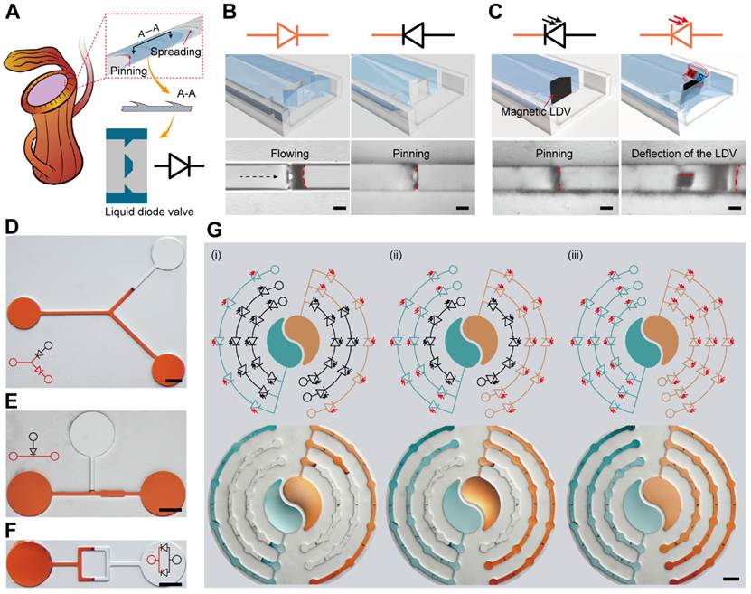 開(kāi)放式微流控技術(shù)利用毛細(xì)力驅(qū)動(dòng)液體實(shí)現(xiàn)自發(fā)流動(dòng),顯著降低了微流控系統(tǒng)的復(fù)雜度。通常在開(kāi)放式微流控設(shè)備中,需要微流控閥來(lái)控制流體。然而現(xiàn)有的毛細(xì)閥難以實(shí)現(xiàn)對(duì)液體流動(dòng)的編程控制,這限制了復(fù)雜開(kāi)放式微流控系統(tǒng)的構(gòu)建。近日,北航機(jī)械學(xué)院仿生與微納系統(tǒng)團(tuán)隊(duì)張鵬飛教授課題組受生物啟發(fā),提出了液體二極管閥(LDV)概念,LDV利用非對(duì)稱(chēng)毛細(xì)效應(yīng)實(shí)現(xiàn)單向流動(dòng)及反向固定,若采用磁性材料制成,可進(jìn)一步在開(kāi)放式系統(tǒng)中對(duì)多種液體的流動(dòng)進(jìn)行主動(dòng)控制(圖1),相關(guān)成果“Bioinspired Liquid Diode Valve Enables Programable Control of Liquid Flow in Open-channel Microfluidics”發(fā)表于權(quán)威期刊《Advanced Functional Materials》上。