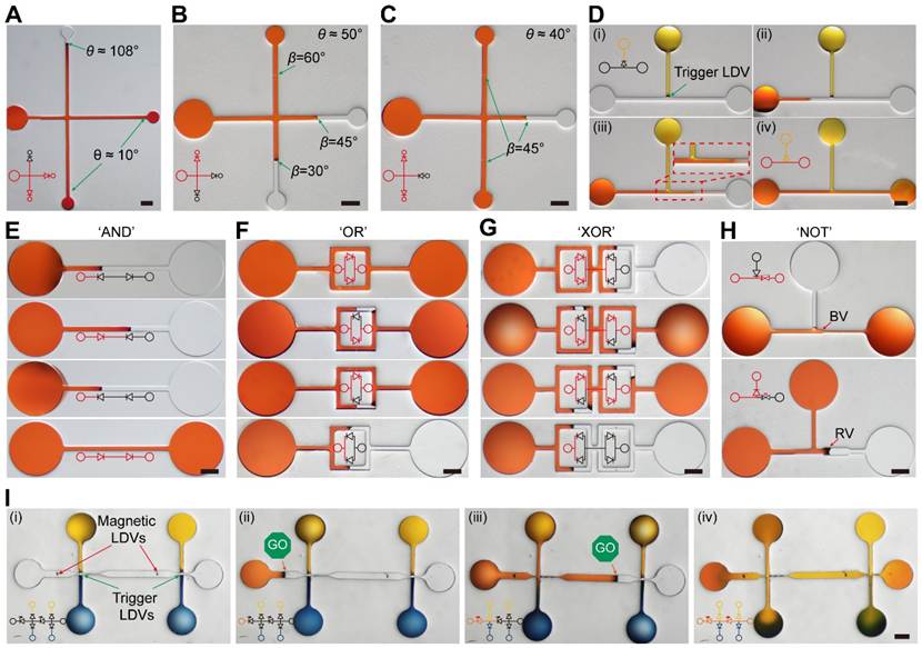 作者借鑒豬籠草口緣各向異性微腔結(jié)構(gòu),并將其簡(jiǎn)化為“門(mén)型”不對(duì)稱(chēng)立柱。研究首先表征并分析了微閥控制流體正向流動(dòng)、反向自動(dòng)釘扎,以及由閥芯偏轉(zhuǎn)驅(qū)動(dòng)的反向流動(dòng)的機(jī)理。實(shí)驗(yàn)分析了閥門(mén)的靜態(tài)調(diào)控規(guī)律與閥門(mén)結(jié)構(gòu)特征參數(shù)的關(guān)聯(lián):正向流動(dòng)時(shí),隨著流道表面本征接觸角q0增大,液體浸潤(rùn)閥門(mén)的時(shí)間延長(zhǎng),邊緣角b越大,正向流動(dòng)的臨界接觸角qfc越高,實(shí)驗(yàn)所得到的臨界接觸角qfc與自由能模型高度吻合。通過(guò)實(shí)驗(yàn)確定反向釘扎的臨界接觸角qbc?30°,且對(duì)邊緣角b與閥門(mén)縫寬度wg不敏感。通過(guò)磁偏轉(zhuǎn),反向釘扎的液體可在0.5 s內(nèi)突破閥門(mén),實(shí)現(xiàn)再次流動(dòng)。研究表明,通過(guò)調(diào)節(jié)LDV的潤(rùn)濕性、邊緣角、取向和主動(dòng)偏轉(zhuǎn),可精確的控制液體的流動(dòng)與釘扎。作者構(gòu)建AND、OR、XOR、NOT等液體邏輯門(mén),并演示觸發(fā)閥、延時(shí)閥、選擇閥等功能(圖2)。通過(guò)磁場(chǎng)陣列順序開(kāi)閥,實(shí)現(xiàn)液體的有序混合等功能。