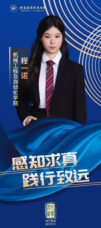 程一諾,北京航空航天大學(xué)機(jī)械工程及自動(dòng)化學(xué)院2022級(jí)本科生。綜合成績(jī)位列年級(jí)第一(1/208),82門課程90分以上。連續(xù)兩年獲得國(guó)家獎(jiǎng)學(xué)金、校級(jí)優(yōu)秀生、校級(jí)三好學(xué)生。累計(jì)任書院學(xué)生會(huì)主席、院學(xué)支部長(zhǎng),小班班長(zhǎng)等11項(xiàng)學(xué)生工作,服務(wù)人次9000+。共獲“北航之友”獎(jiǎng)學(xué)金一等獎(jiǎng)、學(xué)習(xí)優(yōu)秀獎(jiǎng)學(xué)金一等獎(jiǎng)等校級(jí)及以上獎(jiǎng)項(xiàng)榮譽(yù)35項(xiàng)。