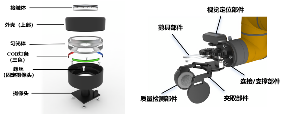 受果農(nóng)觸感經(jīng)驗(yàn)的啟發(fā),牽頭立項(xiàng)“高精度視觸覺傳感器”國(guó)家級(jí)大創(chuàng)項(xiàng)目,提出“COB光源結(jié)合樹脂勻光體”方案,并創(chuàng)新引入鎵銦合金反射層,顯著提升成像質(zhì)量。通過(guò)搭建Faster-RCNN網(wǎng)絡(luò),實(shí)現(xiàn)紋理識(shí)別準(zhǔn)確率97.79%;運(yùn)用多維力解耦算法解算力信息。經(jīng)歷四次迭代傳感器硬件架構(gòu),最終和團(tuán)隊(duì)一起研制出可實(shí)現(xiàn)農(nóng)作物無(wú)損檢測(cè)與采摘的樣機(jī),完成了視觸覺技術(shù)在現(xiàn)代農(nóng)業(yè)中的初步探索。此外,基于對(duì)仿生學(xué)的興趣,作為核心成員參與“基于傳感融合的自主跨界質(zhì)仿生吸附機(jī)器人”項(xiàng)目,負(fù)責(zé)兩代鮣魚吸盤結(jié)構(gòu)設(shè)計(jì)、液態(tài)金屬傳感器研發(fā)與電路搭建,以及吸附狀態(tài)數(shù)據(jù)處理。完成機(jī)身裝配、水池測(cè)試與推力采集,并設(shè)計(jì)單目相機(jī)防水連接機(jī)構(gòu)。該項(xiàng)目將仿生吸盤應(yīng)用于兩棲機(jī)器人,通過(guò)“搭便車”方式提升無(wú)人機(jī)續(xù)航。相關(guān)研究成果已合作發(fā)表于SCI 期刊,另一篇關(guān)于跨界質(zhì)飛行器的成果也發(fā)表在SES Annual Technical Meeting國(guó)際會(huì)議上。