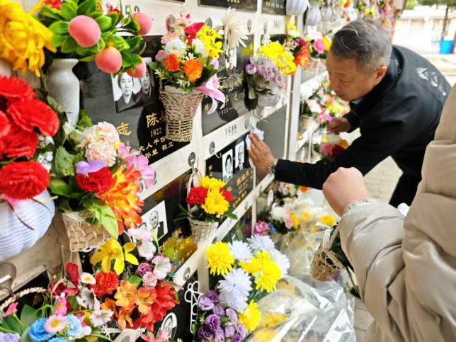 王田苗緩步走到張啟先墓碑前,俯身輕輕擦拭墓碑,動(dòng)作緩慢而鄭重。隨后,師生們依次上前,將手中的白菊整齊擺放在墓碑四周。