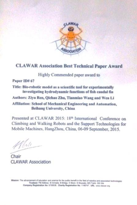 機(jī)械工程及自動化學(xué)院2014級研究生任子宇的論文“Bio-robotic model as a scientific tool for experimentally investigating hydrodynamic functions of fish caudal fin”獲得第18屆International Conference on Climbing and Walking Robots Conference的“Best Technical Paper Award”獎項(xiàng),任子宇還對該研究的最新進(jìn)展于2015年9月9日進(jìn)行了宣講。該論文的指導(dǎo)教師與通訊作者為文力副教授。