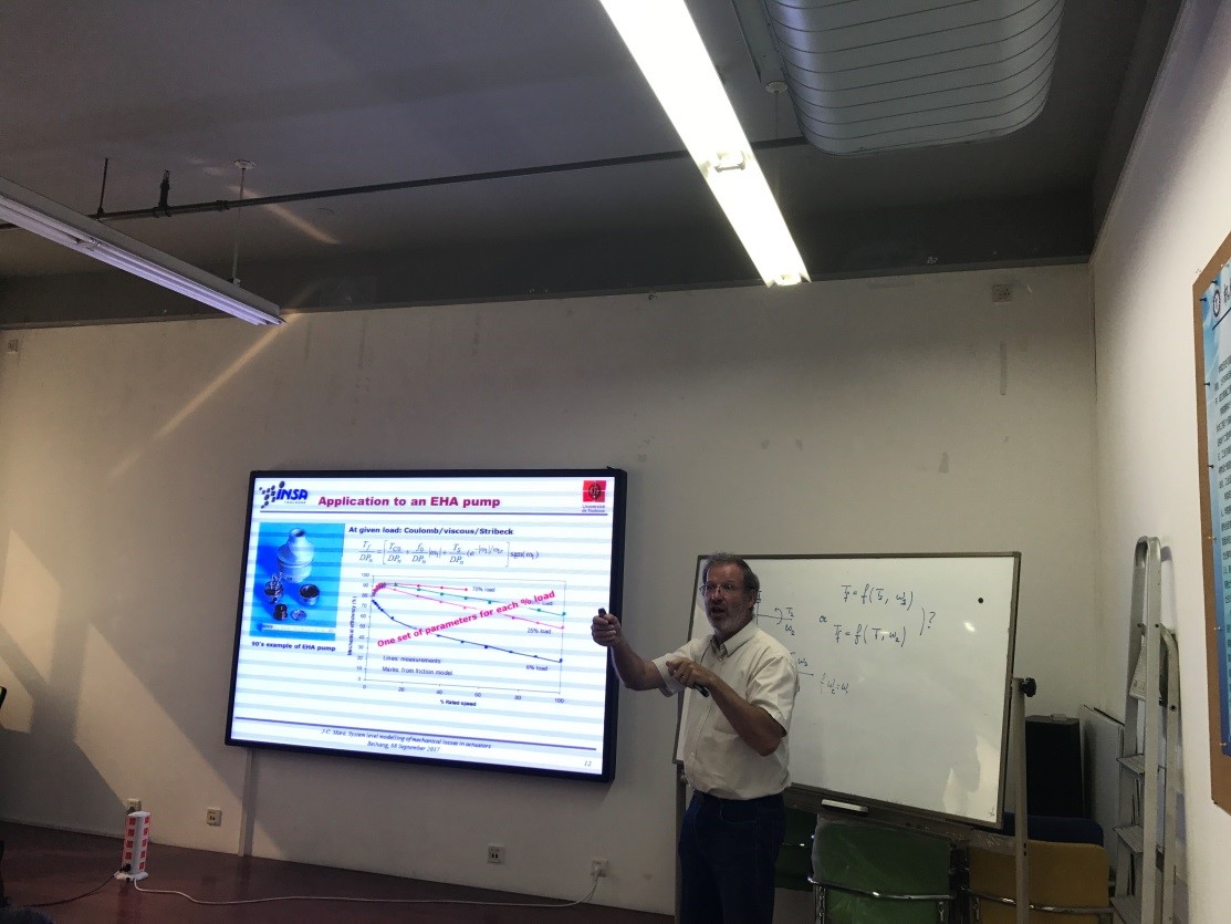 第一場報告中,MARE教授首先介紹了針對航空作動器組件進(jìn)行機(jī)械(摩擦等)損耗建模的必要性,既能降低設(shè)計開發(fā)的時間和成本,同時也更加符合環(huán)境友好型產(chǎn)品的發(fā)展趨勢。他結(jié)合自己多年來航空科研經(jīng)驗(yàn),通過理論與仿真相結(jié)合的形式,詳盡的介紹了摩擦效應(yīng)在作動器核心組件如EHA泵、減速器、EMA絲杠等的應(yīng)用研究。報告后,流體中心的老師和同學(xué)們,以及33所的專家針對自己在研究過程中遇到的疑難點(diǎn)同Mare教授進(jìn)行交流。