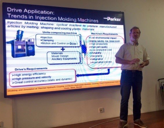 第二場報告是基于MARE教授與美國Parker公司合作的研究成果,該研究的是對象是一款應(yīng)用于新型注塑機(jī)的研制。MARE教授從注塑機(jī)的驅(qū)動器、機(jī)械部分出發(fā),逐步細(xì)化,同時針對液壓伺服模塊(包括泵、殼體、電機(jī))的熱液壓模型進(jìn)行了講解,闡述了熱建模仿真技術(shù)的在機(jī)電一體化產(chǎn)品研制中的重要意義。