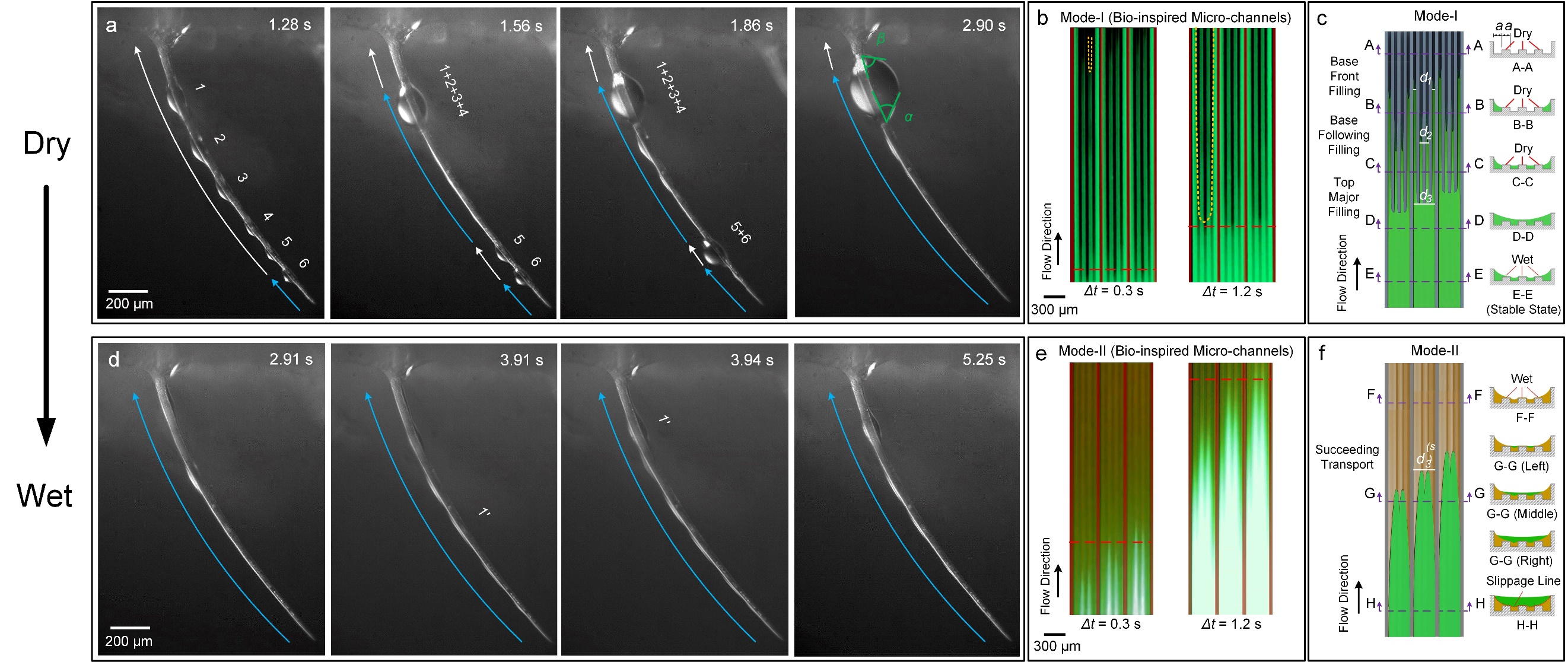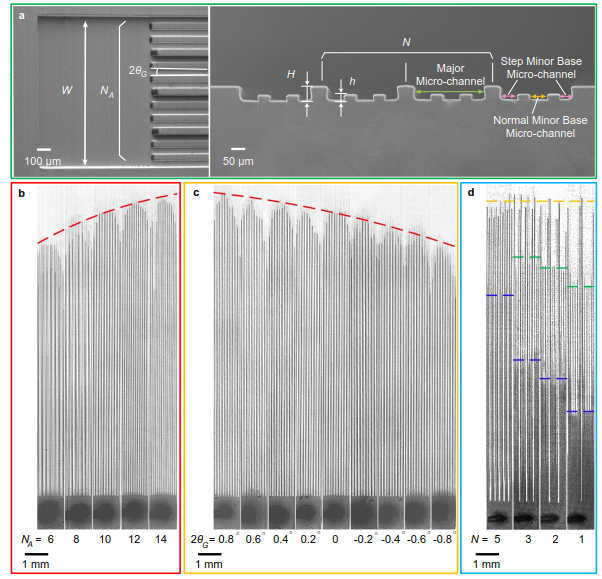 研究團隊深入分析了絨毛的表面微觀結(jié)構(gòu)特征,首次發(fā)現(xiàn)了特殊的高低棱多級微納溝槽結(jié)構(gòu),即相鄰高棱間分布3~5個低棱(圖1)。在此高低棱多級微納溝槽結(jié)構(gòu)上,液體在表面干濕狀態(tài)下會相繼出現(xiàn)兩種不同的輸送模式。當(dāng)多級微納表面結(jié)構(gòu)處于干燥狀態(tài)時,液體傳輸主要依靠固-液接觸產(chǎn)生的毛細(xì)力,此時液體傳輸模式與仙人掌刺、蜘蛛絲相類似,表現(xiàn)為大液滴移動方式,即傳輸模式I(圖2a-c)。由于高低棱溝槽結(jié)構(gòu)產(chǎn)生的毛細(xì)力呈梯度分布,傳輸模式I下的液體傳輸速度也不盡相同,呈現(xiàn)出快、慢速度梯度。而當(dāng)高低棱溝槽結(jié)構(gòu)潤濕后,一層穩(wěn)定的水膜會維持在表面上,降低三相接觸線,避免后續(xù)液體與絨毛固體表面直接接觸,液體傳輸動力就變?yōu)橐?/span>-液接觸的超滑毛細(xì)力,顯著降低后續(xù)液體傳輸阻力,加速了后續(xù)的液體傳輸,即傳輸模式II(圖2d-f)。研究團隊還通過光刻技術(shù)制造出相應(yīng)的仿生微納結(jié)構(gòu)(圖3),驗證了微納高低棱結(jié)構(gòu)的高速液體傳輸性能,并基于Lucas-Washburn原理、Onsager原理與邊界滑移理論分別建立了兩種傳輸模式的理論模型。進一步揭示了高低棱多級微納結(jié)構(gòu)參數(shù)對超高速傳輸?shù)挠绊懸?guī)律,提出超高速輸送高低棱結(jié)構(gòu)仿生設(shè)計準(zhǔn)則。研究成果可應(yīng)用于微流體芯片、高效散熱結(jié)構(gòu)、液體收集與海水淡化裝置等亟需高速液體收集與傳輸?shù)念I(lǐng)域。