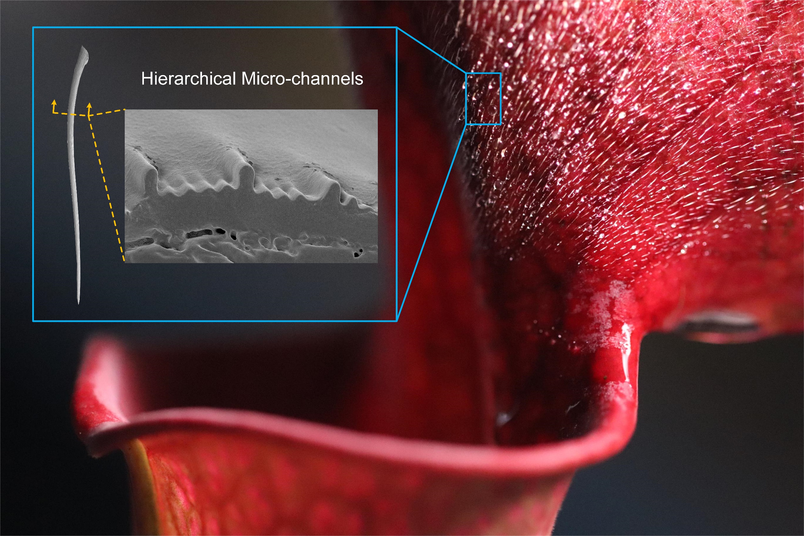 液體高速傳輸在機械、電子與新能源等領(lǐng)域具有極其重要的應(yīng)用價值,如何提升液體傳輸能力一直是重要研究課題。捕蟲植物的優(yōu)異濕滑機制引起了研究團隊的關(guān)注,對瓶子草(學(xué)名:Sarracenia)蓋子上的細(xì)長絨毛液體收集與傳輸開展了系統(tǒng)研究。通過觀測發(fā)現(xiàn)瓶子草絨毛通過收集空氣中的潮濕水氣來維持表面的濕滑特性,其集水傳輸速度比現(xiàn)有的仙人掌刺、蜘蛛絲提高了三個量級。