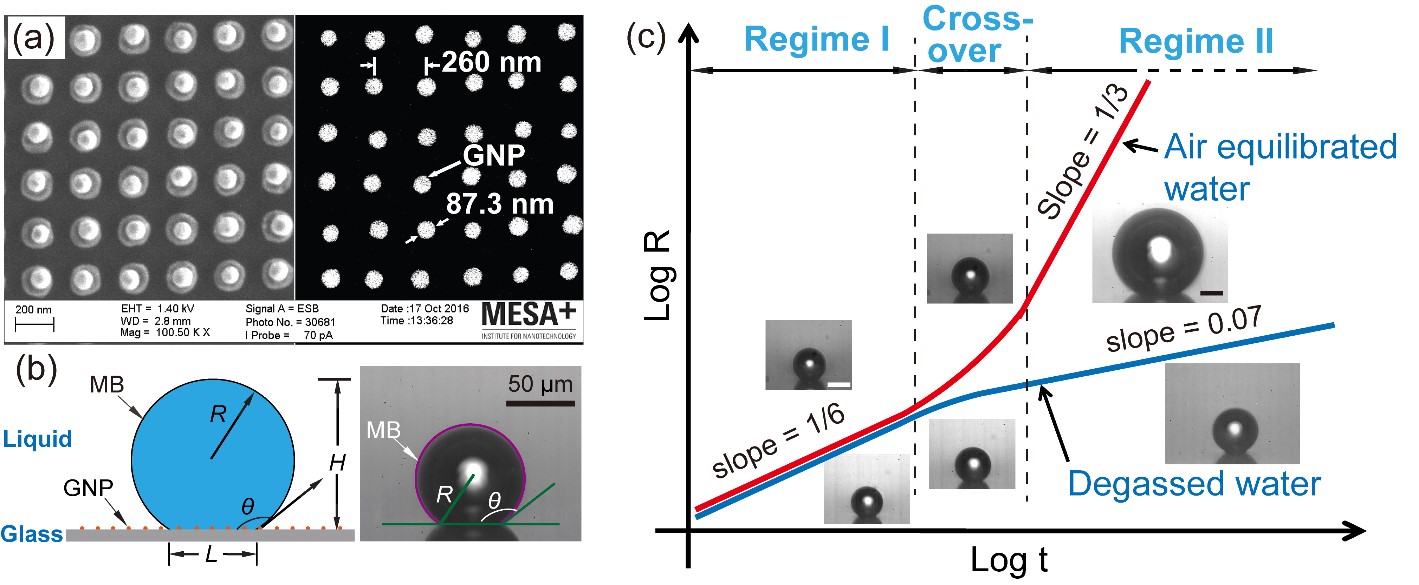 金、銀、鉑等貴金屬納米顆粒在激光照射下存在離子體效應(yīng),能夠迅速的將光能轉(zhuǎn)化為熱能。在液下環(huán)境中,轉(zhuǎn)化得到的熱能迅速把水汽化,生成微米級氣泡,稱之為等離子氣泡。等離子氣泡在太陽能利用、微納操作、醫(yī)學(xué)影像增強(qiáng)、以及癌癥診斷等方面有巨大的應(yīng)用潛力,成為近年來微納領(lǐng)域的熱點(diǎn)研究方向。一直以來,研究人員普遍認(rèn)為等離子氣泡主要由水蒸氣組成。北航機(jī)械工程及自動化學(xué)院王玉亮副教授聯(lián)合荷蘭特溫特大學(xué)以及澳大利亞皇家墨爾本大學(xué)的科研人員,利用超高速攝像機(jī),在納米金粒子結(jié)構(gòu)化表面(圖a)生成等離子氣泡(圖b)。通過觀測等離子氣泡產(chǎn)生的動態(tài)過程,在國際上首次揭示其產(chǎn)生機(jī)理。他們的研究表明,等離子氣泡只有在產(chǎn)生后的大約10 ms以內(nèi)主要由水汽組成(圖c,Regime I)。而后,水中溶解的空氣逐漸通過液氣界面擴(kuò)散,進(jìn)入氣泡中,并在隨后的氣泡生長環(huán)節(jié)起主要作用。這一研究結(jié)果,對其他等離子體氣泡相關(guān)應(yīng)用具有重要的指導(dǎo)意義,也為課題組下一步基于等離子體氣泡的應(yīng)用研究奠定了基礎(chǔ)。