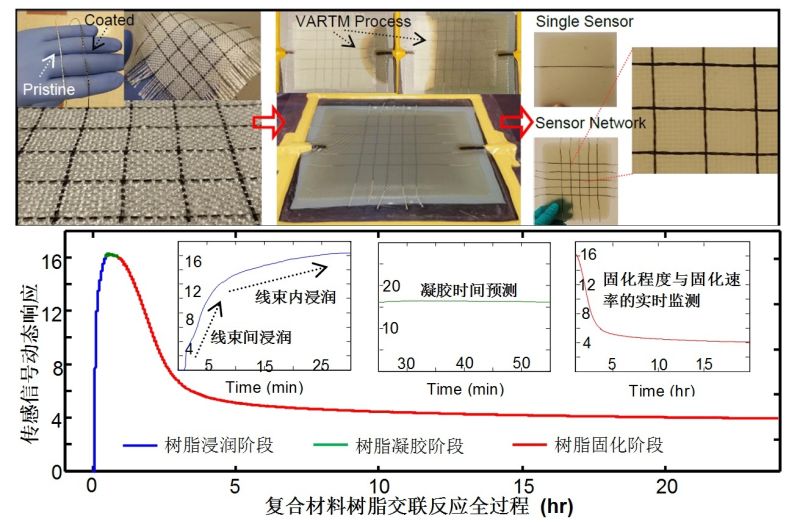 復材增強織布共編織、共固化的涂層纖維傳感器。并對傳感器微觀形貌-電學信號-樹脂交聯(lián)反應之間的關系進行了系統(tǒng)研究,表明傳感網(wǎng)絡電學信號的動態(tài)變化可以有效地與樹脂浸潤模式與速度、凝膠時間、固化程度與速率等關鍵多物理參量關聯(lián)。與差式溫度掃描和流變等傳統(tǒng)非原位檢測方法相比,這一技術實現(xiàn)原位監(jiān)測的同時,可以在不同固化溫度、不同固化劑配比等多成型條件下進行監(jiān)測應用。此外,該纖維傳感單元可以擴展為矩陣式的傳感網(wǎng)絡來實現(xiàn)多點局部位置的狀態(tài)掃描,對保障復合材料復雜大型結(jié)構(gòu)件的工藝質(zhì)量提供了技術基礎。
