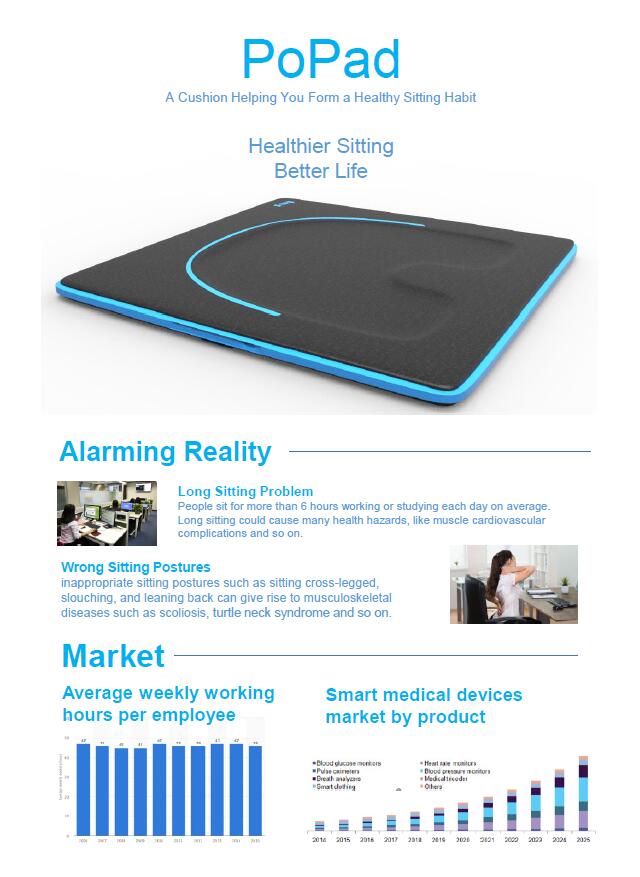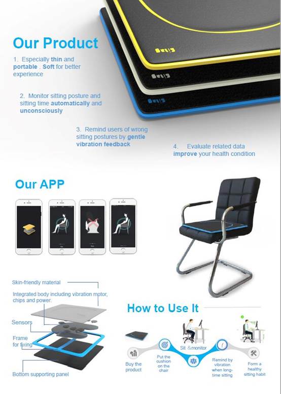 現(xiàn)今的大城市中,人們由于久坐或者不良坐姿受到了許多健康問(wèn)題的困擾。Footprinter團(tuán)隊(duì)研發(fā)了一款可以監(jiān)測(cè)用戶坐姿并及時(shí)進(jìn)行干預(yù)的智能坐墊。該智能坐墊通過(guò)內(nèi)置的八個(gè)薄膜壓力傳感器來(lái)采集用戶的坐時(shí)、坐姿等信息,在用戶久坐或者長(zhǎng)期處于不良坐姿時(shí),其會(huì)通過(guò)內(nèi)置的振動(dòng)馬達(dá)模塊來(lái)進(jìn)行相應(yīng)的提醒與糾正。此外,該智能坐墊還配備有手機(jī)端的APP。用戶可以通過(guò)APP實(shí)時(shí)獲得自己的坐姿信息,并且對(duì)坐墊的相關(guān)參數(shù)、提醒頻率等進(jìn)行設(shè)置。