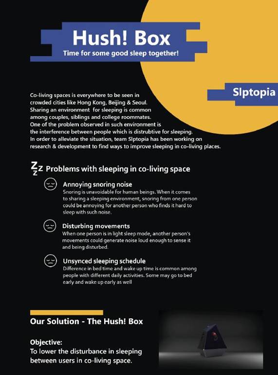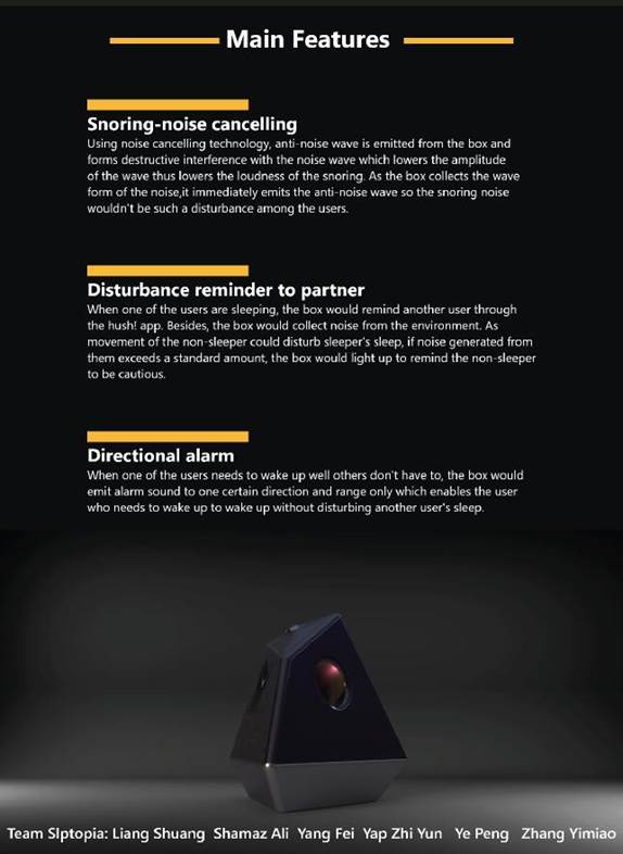 Slptopia團(tuán)隊(duì)從大學(xué)生宿舍生活的睡眠干擾現(xiàn)象的痛點(diǎn)出發(fā),針對(duì)高密度人口城市中共享睡眠空間的人群(例如:住宿學(xué)生、換班職工)設(shè)計(jì)了一款名為Hush Box的智能情感化交互裝置,旨在解決因不同作息時(shí)間、走動(dòng)、聲音而造成的睡眠干擾問(wèn)題。產(chǎn)品以多面體呼吸燈的形式呈現(xiàn),在不同面體上分布不同功能觸發(fā)裝置。主要功能為:主動(dòng)降噪控制、通過(guò)APP及燈光變化提醒噪音來(lái)源方、睡眠檢測(cè)和白噪音喚醒。在最終樣機(jī)中,通過(guò)借助ANC等相關(guān)技術(shù),產(chǎn)品可以在有限范圍內(nèi)實(shí)現(xiàn)噪音減小效果。