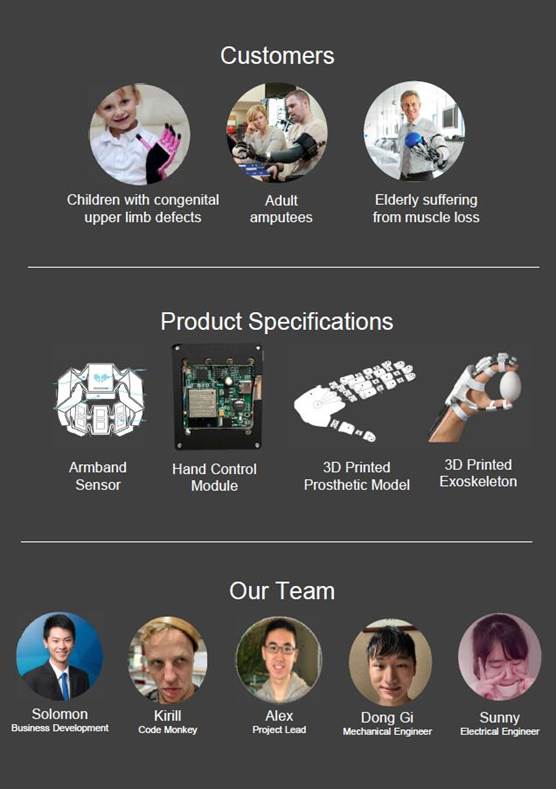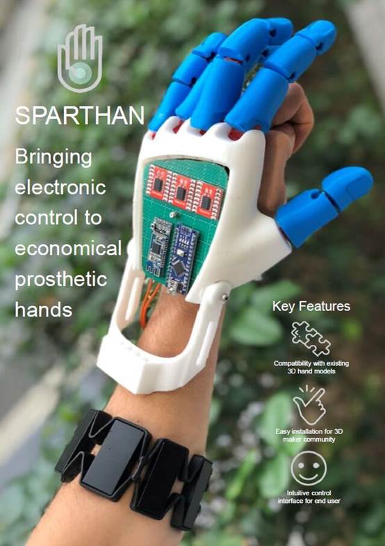 手部缺失的殘疾兒童隨著年齡的成長(zhǎng),需要經(jīng)常更換手部假肢以適應(yīng)身體的變化,然而此類假肢一般售價(jià)昂貴,維護(hù)困難。Sparthan團(tuán)隊(duì)利用自身的機(jī)器人開(kāi)發(fā)優(yōu)勢(shì),針對(duì)殘疾兒童的需求,開(kāi)發(fā)了一款開(kāi)源的低成本模塊化假肢產(chǎn)品。產(chǎn)品由臂環(huán)傳感器、易操作的核心控制模塊、3D打印的手部關(guān)節(jié)和外骨骼組成,伴隨著殘疾兒童的成長(zhǎng),他們只需定制和更換組件中成本相對(duì)最低的3D打印的手部關(guān)節(jié),即可滿足自己新的需求。同時(shí)這款產(chǎn)品也為假肢的研發(fā)人員提供了一個(gè)開(kāi)源的、友好的、可用性更高的測(cè)試及實(shí)驗(yàn)材料。