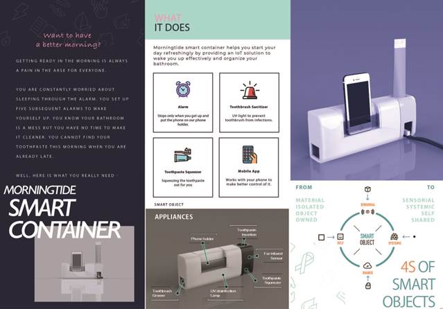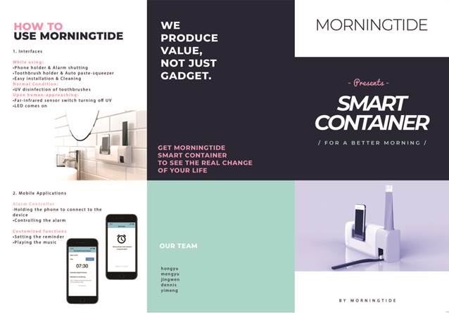 由Morningtide團(tuán)隊(duì)設(shè)計(jì)搭建的晨間效率提升站,是一款多功能IoT智能收納盒,為有效喚醒上班族與學(xué)生黨,協(xié)助收納整理浴室提供了物聯(lián)網(wǎng)解決方案,助力奮斗者以清新的早晨高效地開(kāi)始新的一天。晨間效率提升站由手機(jī)APP智控,集感應(yīng)鬧鐘與自動(dòng)牙膏、洗漱用具與手機(jī)收納、紅外感應(yīng)與紫外消毒于一身,滿足青年奮斗者健康、高效、智控的需求。團(tuán)隊(duì)完成了一件商業(yè)前景廣闊的敏捷產(chǎn)品設(shè)計(jì)與制造,也在過(guò)程中提升了綜合管理、商業(yè)、設(shè)計(jì)、制造的綜合實(shí)踐能力。