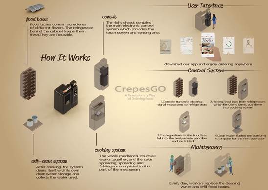 當(dāng)你徘徊在辦公樓里,吃膩了門(mén)口每一家路邊餐館;當(dāng)你加班餓到饑腸轆轆,能買(mǎi)到的熱食只有售貨機(jī)里的咖啡;當(dāng)你妄圖走遍大街小巷,找不到一家衛(wèi)生健康的煎餅果子。如果飲料可以從自動(dòng)販賣(mài)機(jī)買(mǎi),零食可以,咖啡可以,那煎餅也可以!FOODIE-Tec團(tuán)隊(duì)設(shè)計(jì)的煎餅自動(dòng)販賣(mài)機(jī),有著優(yōu)雅的造型,巧妙清晰可觀賞的制作工藝,用戶定制的口味和加料,使用感友好的下單程序。突破傳統(tǒng)自動(dòng)售貨機(jī)的概念約束,讓煎餅從路邊攤變成咖啡一樣觸手可及。