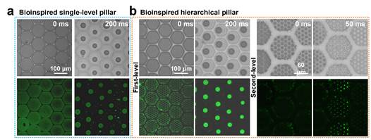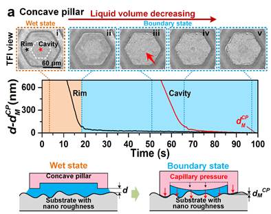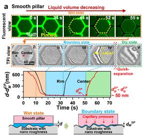 進(jìn)一步對表界面液膜原位表征,發(fā)現(xiàn)密排棱柱結(jié)構(gòu)在抬步的過程中會自發(fā)將液膜從溝槽內(nèi)均勻地分裂開,使液體運(yùn)動并停留在每個棱柱表面上,即液膜自碎化。隨著界面液量減少,這種液膜分裂行為會依次出現(xiàn)在第一、二級棱柱表面上,達(dá)到兩級液膜自碎化效應(yīng)(圖3),從而能使液膜能夠均勻地分布于整個仿生表面。