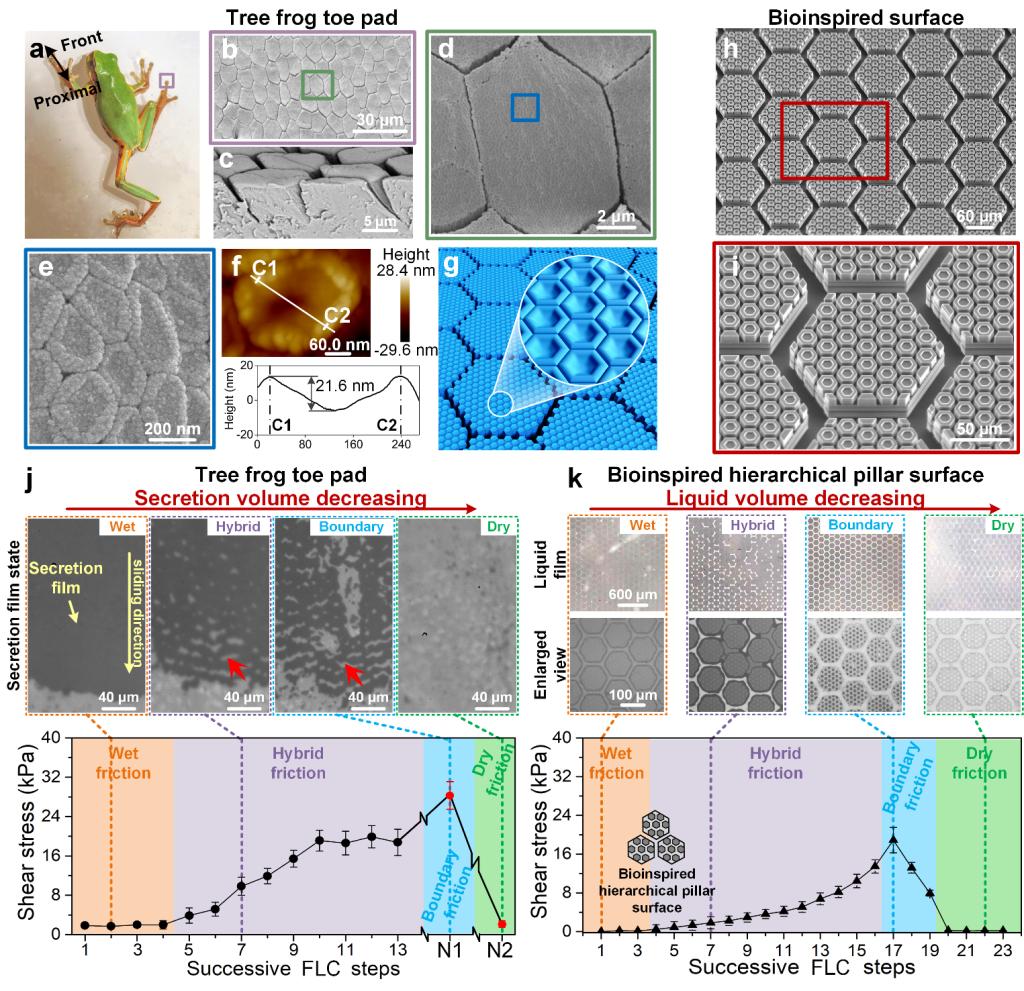 本文通過表征樹蛙腳掌,發(fā)現(xiàn)其表面覆蓋著微納多級棱柱陣列,且每個納米棱柱頂部都有納米凹坑結(jié)構(gòu)。為了揭示界面液膜的行為機(jī)制,師法自然設(shè)計制備出多種仿生多級結(jié)構(gòu)表面,模仿模仿樹蛙爬行行為,對樹蛙腳掌和仿生表面進(jìn)行了連續(xù)抬步摩擦測試(FLC),兩者表現(xiàn)出了極其相似的界面液膜狀態(tài)和摩擦力變化規(guī)律(圖2)。即,隨著抬步數(shù)增加,界面粘液逐漸減少,由濕變干過程中會出現(xiàn)一個摩擦力峰值,與濕、干狀態(tài)相比增大超20余倍,明顯有別于傳統(tǒng)機(jī)械表面摩擦。