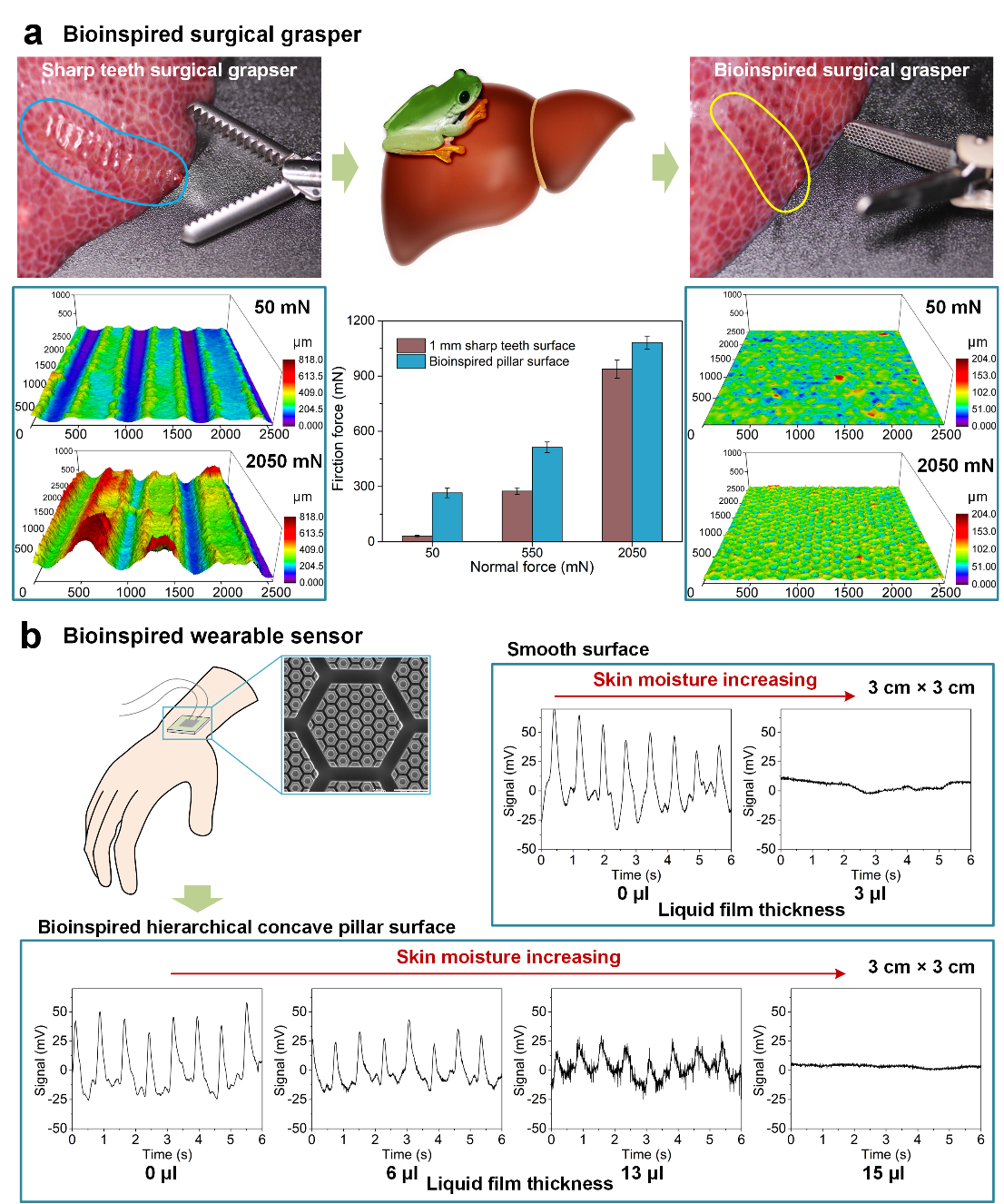 針對手術(shù)夾鉗和可穿戴傳感生/機(jī)表面的濕滑脫問題,引入仿樹蛙腳掌強(qiáng)濕摩擦機(jī)制,實(shí)驗(yàn)結(jié)果表明可以有效增強(qiáng)夾鉗在低夾持力下的摩擦力并減小組織變形量,降低組織損傷率,增強(qiáng)可穿戴傳感表面對皮膚汗液承受性能,提高傳感精準(zhǔn)度(圖6)。