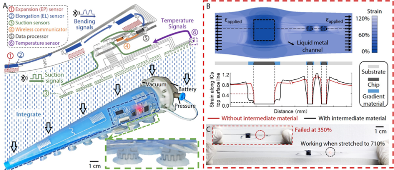 生物章魚(yú)臂的形變程度可以達(dá)到200%—300%,不僅可以拉伸,還可以自如地收縮、彎曲、膨脹。傳統(tǒng)剛性電路板制成的機(jī)器人難以實(shí)現(xiàn)這些力學(xué)性能,因此,研究團(tuán)隊(duì)采用液態(tài)金屬柔性電路,為大變形軟體機(jī)器人集成具有多種傳感(例如彎曲、吸力、溫度)及自主信號(hào)處理能力的大拉伸電子系統(tǒng)。在此期間,團(tuán)隊(duì)還解決了柔性基底與硬質(zhì)芯片在大拉伸狀態(tài)下易產(chǎn)生剝離的問(wèn)題,通過(guò)嵌入中間硬度的緩沖材料,有效地降低了芯片連接面處的應(yīng)變,提高了柔性電路的拉伸率。經(jīng)過(guò)增強(qiáng)后,簡(jiǎn)單柔性電路單元在拉伸至710%的狀態(tài)下仍能正常工作,對(duì)于集成傳感以及電子元件的復(fù)雜電路,其拉伸性也從140%提升到了360%。