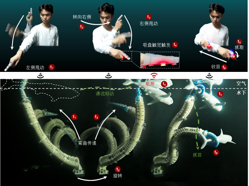 根據(jù)生物章魚(yú)的觀測(cè)數(shù)據(jù),課題組發(fā)現(xiàn),章魚(yú)觸手的抓捕動(dòng)作采取“彎曲波傳遞”的方式,“很像我們揮舞長(zhǎng)鞭,指令從鞭子根部像波一樣傳導(dǎo)到末端”,然后通過(guò)高度敏感的觸手/吸盤(pán)神經(jīng)網(wǎng)絡(luò)觸發(fā)停止和抓取信號(hào),對(duì)物體進(jìn)行抓取并拉回。