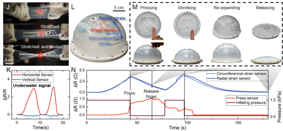 這種增強(qiáng)的柔性電路不僅能夠在單一軸上承受大幅拉伸應(yīng)變,而且還具備對(duì)多軸拉伸應(yīng)變的適應(yīng)能力。更為引人注目的是,這種柔性電路不僅僅被動(dòng)地適應(yīng)變形,而且能夠通過(guò)感知人的交互進(jìn)行主動(dòng)響應(yīng)和相應(yīng)的變形。這種智能化的柔性電路為軟體機(jī)器人的實(shí)時(shí)環(huán)境感知和主動(dòng)決策創(chuàng)造了強(qiáng)有力的基礎(chǔ)。