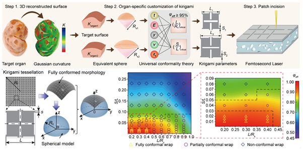 面對這一核心需求,徐曄教授團隊基于旋轉剛性負泊松比結構單元構建的剪紙超材料,創(chuàng)造性提出“器官定制化剪紙共形設計理論”。該理論首次以“有效面積覆蓋率”為核心優(yōu)化指標,建立起器件剪紙結構單元幾何參數(shù)、材料力學屬性與器官曲率之間的定量構效關系。通過對任意器官進行三維掃描建模,該共形理論可給出最優(yōu)剪紙結構參數(shù),實現(xiàn)剪紙結構與功能之間的最佳平衡?;谠摾碚?,研究團隊針對卵巢、腎臟等多種靶器官,定制化設計了相應的剪紙結構貼片,使其在器官復雜曲面上實現(xiàn)自適應貼合與功能最大化。研究結果表明,定制化設計的剪紙貼片在不同器官表面的有效共形覆蓋率均超過95%,有效突破了傳統(tǒng)柔性貼片“共形性與功能區(qū)保留不可兼得”的設計難題。