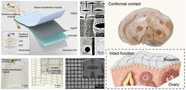在腫瘤及其他重大疾病的治療中,實現(xiàn)對病變器官表面的局部精準干預,是提升療效、降低毒副作用的關鍵。以卵巢疾病治療為例,攜帶BRCA1等遺傳突變的卵巢癌高危女性患者,為降低癌變風險,目前臨床普遍建議手術切除器官,但這將導致患者永久喪失生育功能。傳統(tǒng)全身性給藥或基因遞送方法(如口服、注射)常因路徑長、靶向性差,往往療效有限,甚至可能誤傷周圍正常細胞。即便如納米電穿孔等局部物理遞送技術,也因器件與組織表面共形貼合能力不足,難以在復雜器官表面實現(xiàn)安全、高效的全覆蓋精準干預,更無法有效規(guī)避對正常細胞的干擾,存在效率低、風險高的瓶頸。因此,開發(fā)兼具高度共形貼合與精準遞送功能的生物電子器件,成為臨床治療的迫切需求。