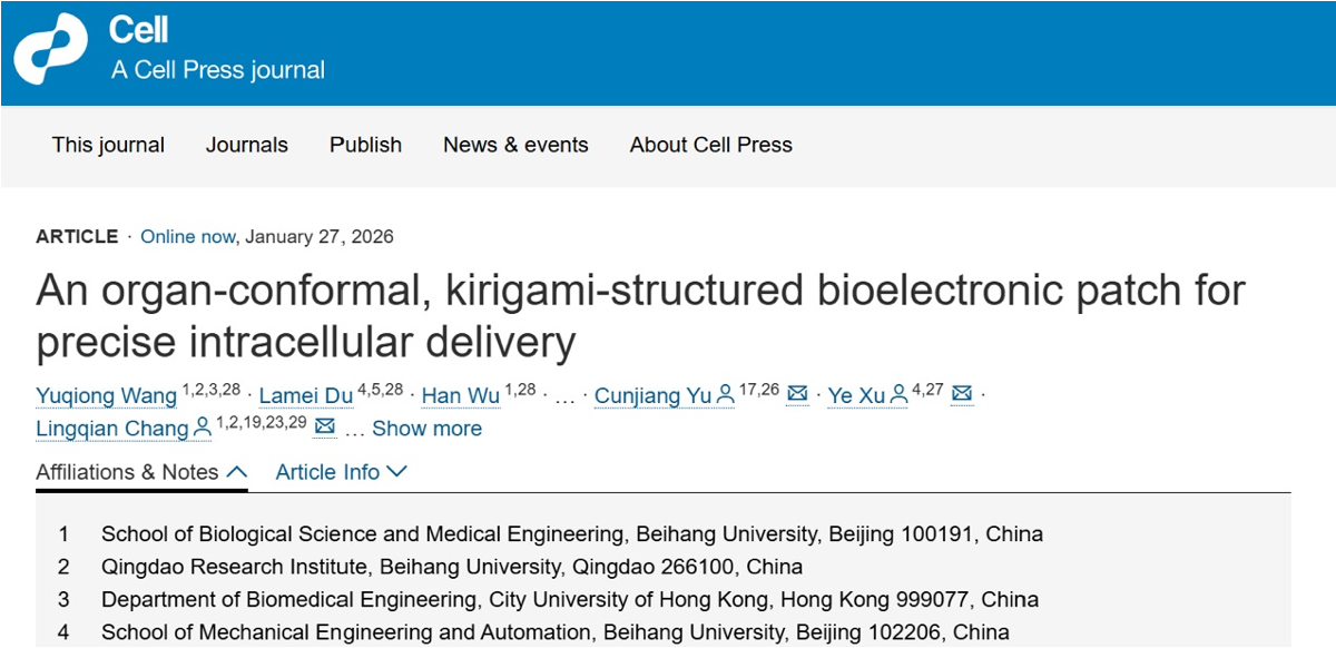 團隊提出了基于“剪紙結構力學”的器官定制化共形理論,并構建出一款柔性高共形生物電子器件,實現(xiàn)了與復雜器官表面的精準貼合與高效藥物/基因遞送。研究成果以“An organ-conformal, kirigami-structured bioelectronic patch for precise intracellular delivery”為題,于2026年1月27日發(fā)表于《Cell》。