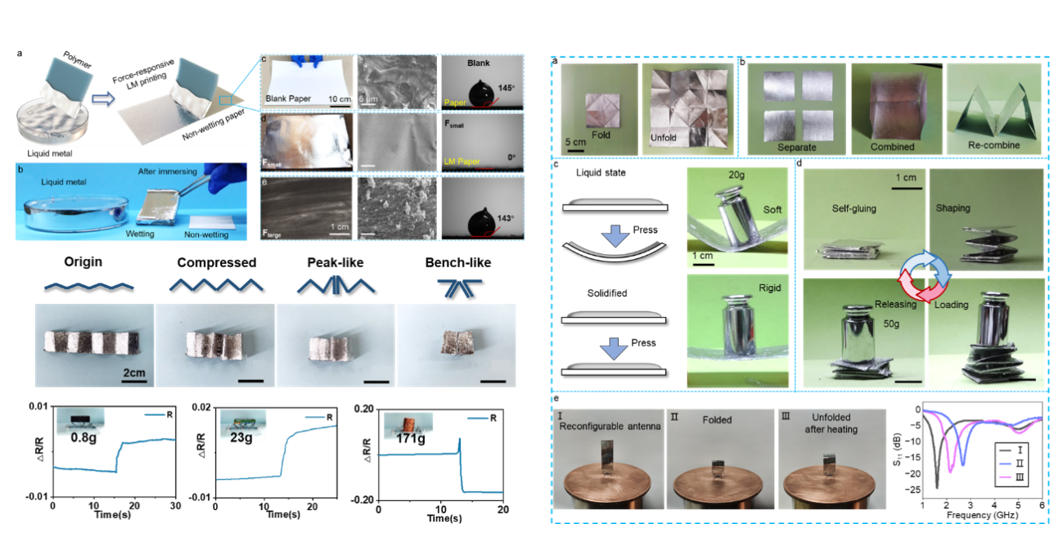 面向液態(tài)金屬與典型功能材料體系(如金屬、玻璃、有機(jī)彈性體等)間的復(fù)合難題,根據(jù)界面相互作用發(fā)展針對(duì)性復(fù)合方法,提出了一種無(wú)需外加材料或電/磁場(chǎng)的基于力響應(yīng)的液態(tài)金屬大面積快速普適化印刷方法,實(shí)現(xiàn)了不同種類(lèi)液態(tài)金屬(EGaIn、BiInSn)在潤(rùn)濕性極差的紙張等基底上快速、穩(wěn)定的復(fù)合方法,并根據(jù)應(yīng)用需求針對(duì)性構(gòu)建兼具多場(chǎng)響應(yīng)性、可重構(gòu)及自修復(fù)等多種功能的智能材料體系,并實(shí)現(xiàn)從微觀界面到宏觀結(jié)構(gòu)的多尺度設(shè)計(jì)策略。