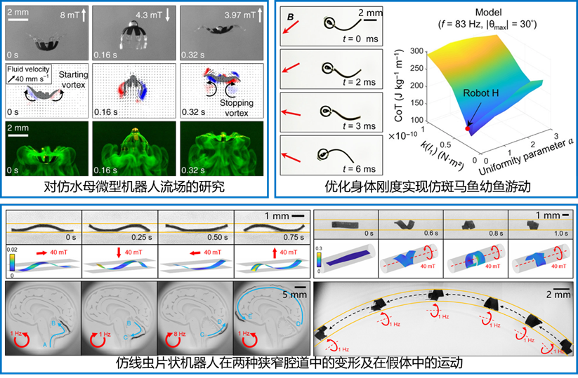 針對面向醫(yī)療應(yīng)用的微型軟體磁驅(qū)機(jī)器人在體內(nèi)復(fù)雜流體環(huán)境(如靜態(tài)液體腔體、動態(tài)流速水域及狹窄充液管腔等)中運(yùn)動能力受限的問題,汲取自然界微小生物的運(yùn)動機(jī)理指導(dǎo)仿生設(shè)計(jì),建立了中雷諾數(shù)下的流固耦合模型與機(jī)器人動力學(xué)理論,揭示了仿水母游動中的渦旋輔助非接觸操控機(jī)制、仿斑馬魚高頻游動中的剛度-效率匹配規(guī)律,以及仿線蟲在受限空間內(nèi)利用被動形變與環(huán)境交互的推進(jìn)機(jī)理,實(shí)現(xiàn)了具備多模態(tài)運(yùn)動、選擇性物質(zhì)輸運(yùn)及復(fù)雜狹腔適應(yīng)能力的一系列微型仿生軟體機(jī)器人。