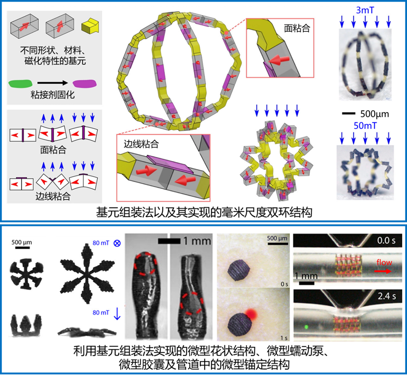 針對現(xiàn)有微型軟體磁驅(qū)機(jī)器人受限于加工技術(shù),難以實(shí)現(xiàn)復(fù)雜三維形狀、非均一材料構(gòu)成及磁化方向預(yù)編程,從而導(dǎo)致運(yùn)動與功能受限的問題,提出了一種微組裝基元加工方法,建立了從有限元結(jié)構(gòu)設(shè)計(jì)、基元離散制造到利用微模具克服表面力干擾的精密組裝工藝流程,實(shí)現(xiàn)了亞毫米至毫米尺度下具有復(fù)雜材料分布與特定磁化特征的微型醫(yī)療機(jī)器人(如微型蠕動泵、膠囊及錨定結(jié)構(gòu)等),并進(jìn)一步將相關(guān)技術(shù)推廣至微米尺度,實(shí)現(xiàn)了微米級磁性雙面微粒的組裝及復(fù)雜三維微結(jié)構(gòu)的高精度制造。
