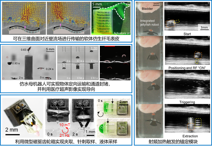 針對微型軟體機(jī)器人因受限于加工工藝、載荷體積及供能控制而難以集成復(fù)雜醫(yī)療功能的問題,提出了基于軟體本體運(yùn)動調(diào)控流場的功能增強(qiáng)策略與高功率密度微型模塊集成方案,建立了利用電控仿生纖毛陣列對近壁流場進(jìn)行多維靈活操控的方法,實(shí)現(xiàn)了基于改進(jìn)型仿水母機(jī)器人的藥物輸運(yùn)、腔道封堵及超聲引導(dǎo)下定點(diǎn)貼附;研制了高減速比微型磁驅(qū)齒輪箱,突破了小尺度下磁驅(qū)動力不足的限制,實(shí)現(xiàn)了針刺活檢與液體采集;提出了基于射頻電場加熱的遠(yuǎn)程觸發(fā)機(jī)制,開發(fā)了按需錨定與靶向給藥模塊,解決了磁驅(qū)運(yùn)動與功能觸發(fā)信號間的耦合干擾難題。