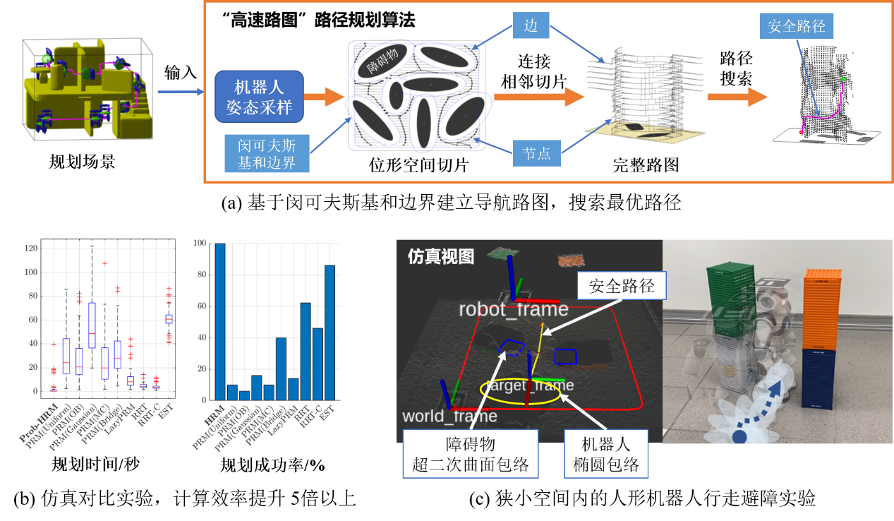 該項目提出了“高速路圖(Highway Roadmap,HRM)”的路徑規(guī)劃算法,運用幾何方法解決了機器人路徑規(guī)劃中關鍵的“狹窄空間”和“高自由度”的問題。其核心基于無碰撞位形空間邊界的解析解。將機器人包絡成橢球的集合,環(huán)境中的障礙物表示為具有光滑表面的嚴格凸體(例如超二次曲面)。通過計算位形空間障礙物邊界,為機器人了提供無碰撞環(huán)境的先驗經驗,從而避免生成對于機器人無效的位形。進而,結合基于隨機采樣的路徑規(guī)劃算法,突破了高維問題中計算復雜度高的瓶頸,將所提的方法延伸到了多自由度的機器人上。相關成果發(fā)表在IEEE Transactions on Robotics (T-RO)期刊上。