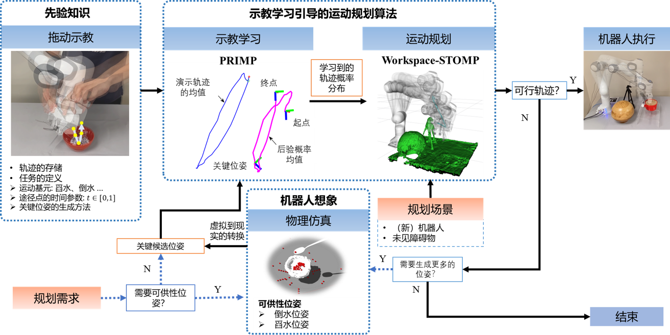 面向機器人在未知居家場景中執(zhí)行復雜操作任務的需求,本研究提出了一種基于概率模型的模仿學習方法PRIMP(PRobabilistically-Informed Motion Primitives)與基于工作空間密度的機械臂軌跡規(guī)劃算法Workspace-STOMP。通過學習物品可供性,在虛擬環(huán)境中模擬倒水、舀水等動作,得到機器人完成特定任務所需的關鍵末端六維位姿,從而生成全新操作軌跡,引導機器人操縱物品。所提出的算法提升了類人操作軌跡生成效率、新環(huán)境中避障成功率及任務完成度。相關成果發(fā)表于IEEE Transactions on Robotics (T-RO)期刊上。