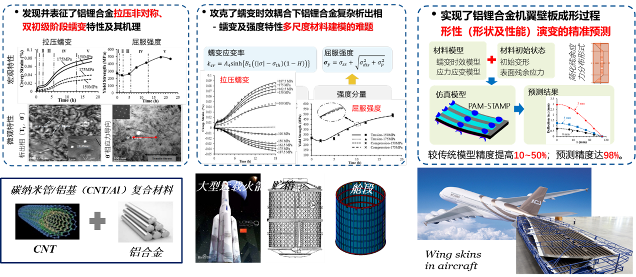 針對(duì)金屬材料(鋁、鈦合金等)及金屬基復(fù)合材料復(fù)雜薄壁構(gòu)件熱力耦合成形制造過(guò)程中微觀組織與宏觀變形/性能演變復(fù)雜、高效調(diào)控方法缺乏等問(wèn)題,建立了基于物理機(jī)制的微-宏觀跨尺度材料本構(gòu)建模方法、基于晶體塑性有限元的微-宏觀結(jié)構(gòu)工藝仿真方法,實(shí)現(xiàn)了多類鋁、鈦合金及其復(fù)合材料熱成形及焊接等制造全過(guò)程形性協(xié)同預(yù)測(cè),為運(yùn)載火箭、大型客機(jī)、直升機(jī)的大型壁板、框梁、封嚴(yán)環(huán)等關(guān)重構(gòu)件制造工藝設(shè)計(jì)及研制應(yīng)用提供關(guān)鍵技術(shù)支撐。