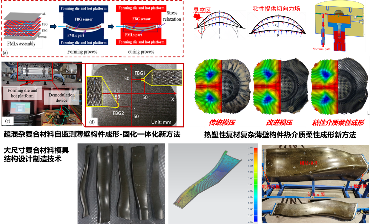 針對(duì)超混雜復(fù)合材料(金屬-復(fù)材層合等)、熱塑性復(fù)合材料成形性能低、成形過(guò)程物理-化學(xué)耦合影響因素多,復(fù)雜薄壁構(gòu)件高質(zhì)量無(wú)損成形困難等問(wèn)題,提出了柔性介質(zhì)冷/溫/熱系列成形新方法,突破了系列復(fù)合材料成形極限,建立了超混雜復(fù)合材料成形-固化過(guò)程全流程仿真模型,實(shí)現(xiàn)了其復(fù)雜薄壁構(gòu)件柔性介質(zhì)成形過(guò)程形性協(xié)同預(yù)測(cè),開(kāi)展了多類空天構(gòu)件研制,為其批產(chǎn)應(yīng)用奠定關(guān)鍵技術(shù)基礎(chǔ)。